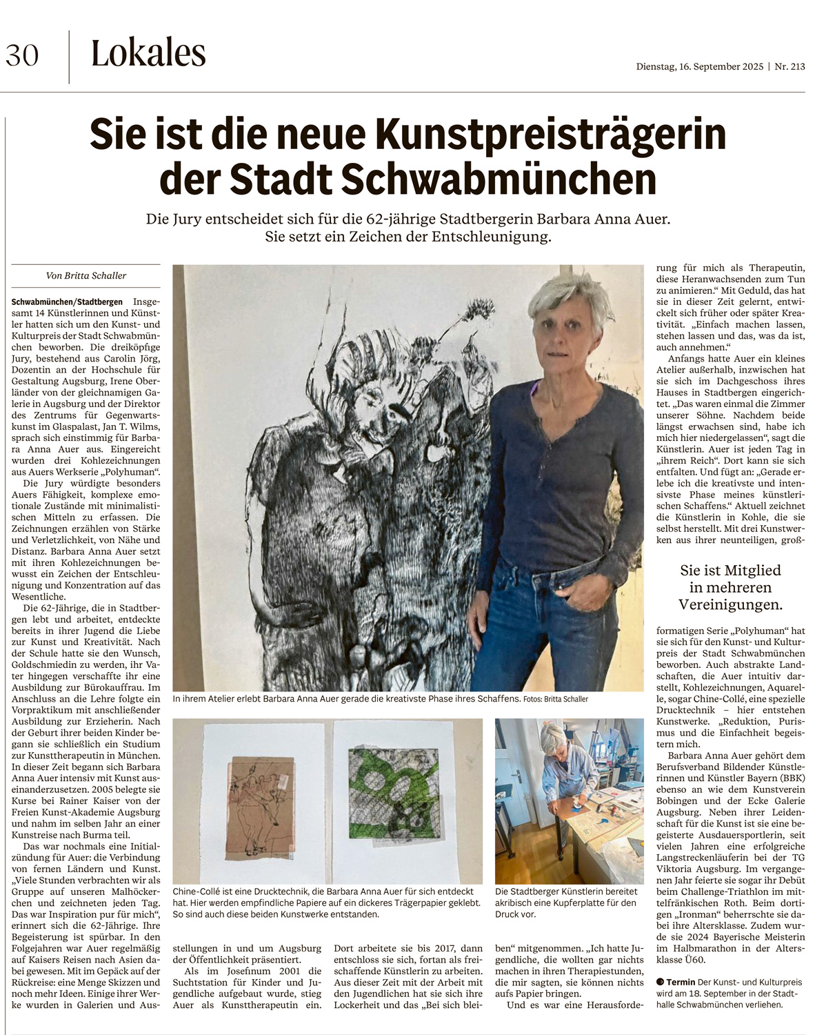 Zeichnungen Druckgrafik Skulpturen Schattenfiguren Kunst- und Kulturpreisträgerin 2025 der Stadt Schwabmünchen polyhuman#2 polyhuman #6 polyhuman #9 Presseartikel zum Kunstpreis Schwabmünchner Zeitung vom 16.9.25Schwabmünchner Heimatzeitung Facebook-f Instagram Mail-bulk